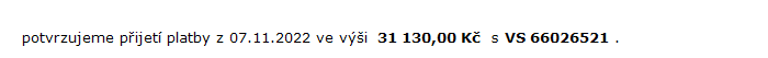 děkujeme, platba za 11/2022 již odešla, za 12/2022 byl již příkaz vytvořen, ale už nevidím, zda byl autorizován - nemám náhled. Obojí na částku 31 130,-Kč. Chyběl nám tento email s úpravou záloh.