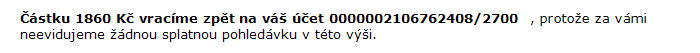 Částku jsme použili k úhradě splatných pohledávek na vašich zákaznických účtech.