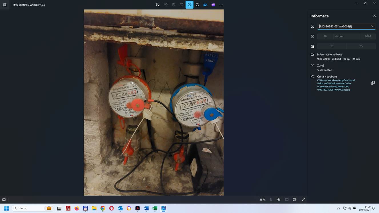 Bohužel pochybuji, že zaslaná fotka vodoměrů je z 5.1.2024, protože dne 8.4.2024 psala paní Topinková paní Horákové viz. níže, že vyfotit vodoměry na začátku roku zapomněla a