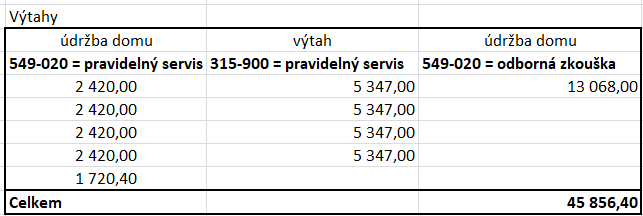 5) Ve vyúčtování je položka Servis tech.zař. G ve výši 8.600 Kč. Podle součtů všech položek je na účtu 549-020 Údržba domu - buď je chybně položka ve vyúčtování, nebo je chybně zaúčtována (možná by měla být na účtu 549-120 Údržba a servis garáže).